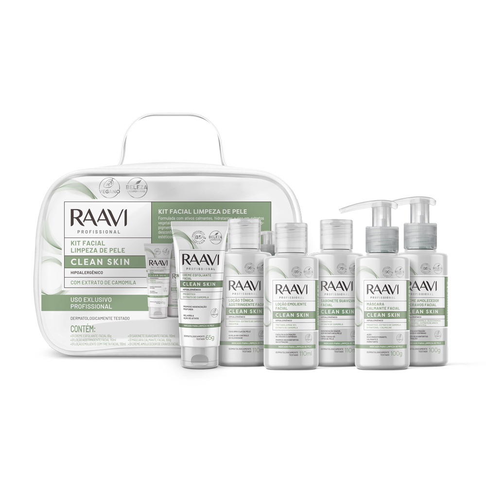 O Kit de Limpeza de Pele Clean Skin é ideal para profissionais de estética que buscam produtos de alta performance, seguros e eficazes. Formulado com extrato de camomila, possui ativos calmantes e hidratantes, sendo perfeito para limpeza de pele profunda, pré e pós-procedimentos como peeling, laser, dermopigmentação e depilação. Ajuda a acalmar, suavizar e reduzir a vermelhidão, promovendo bem-estar imediato para peles sensíveis.